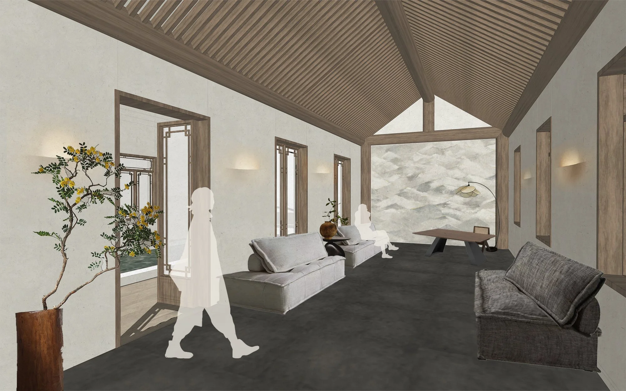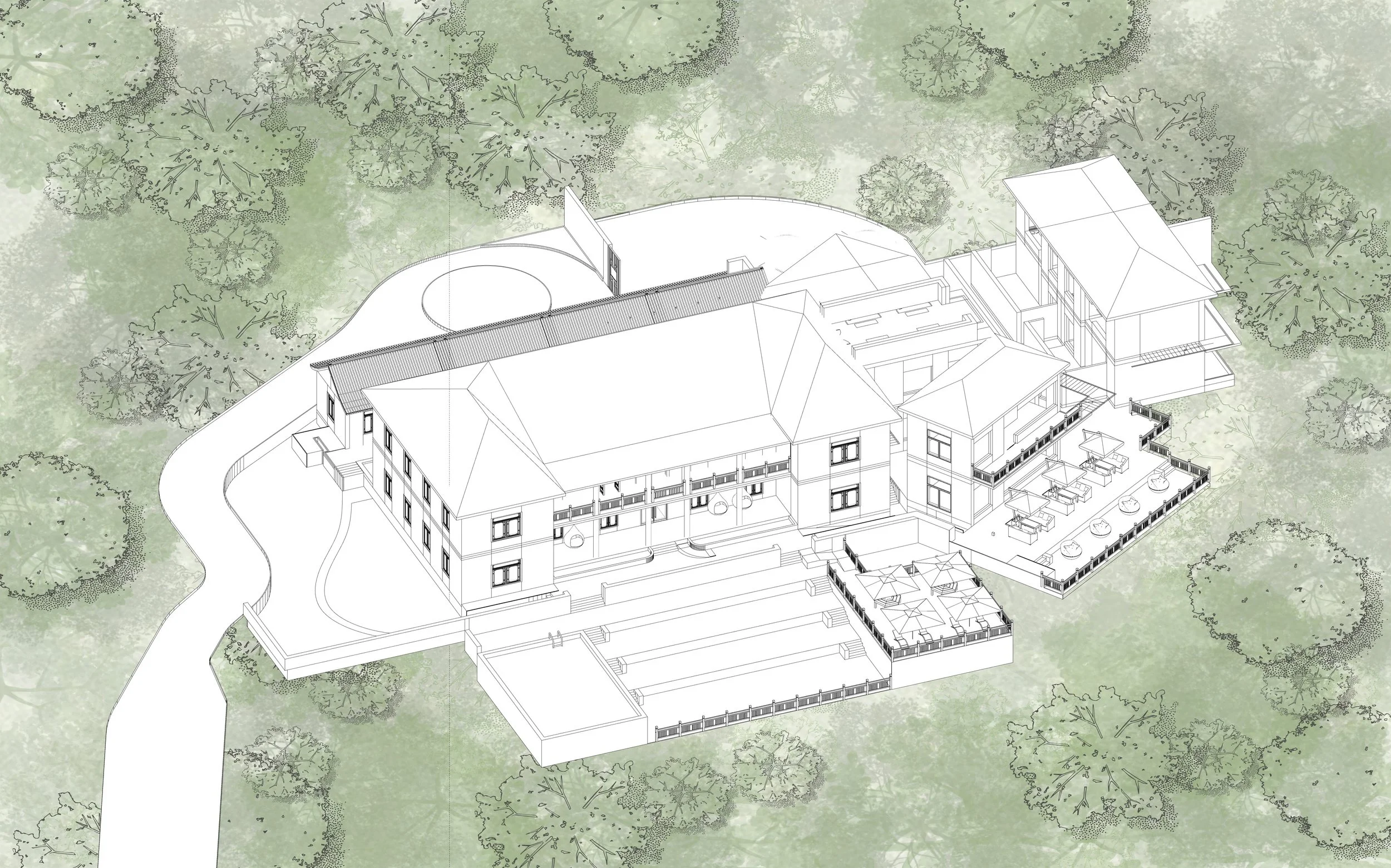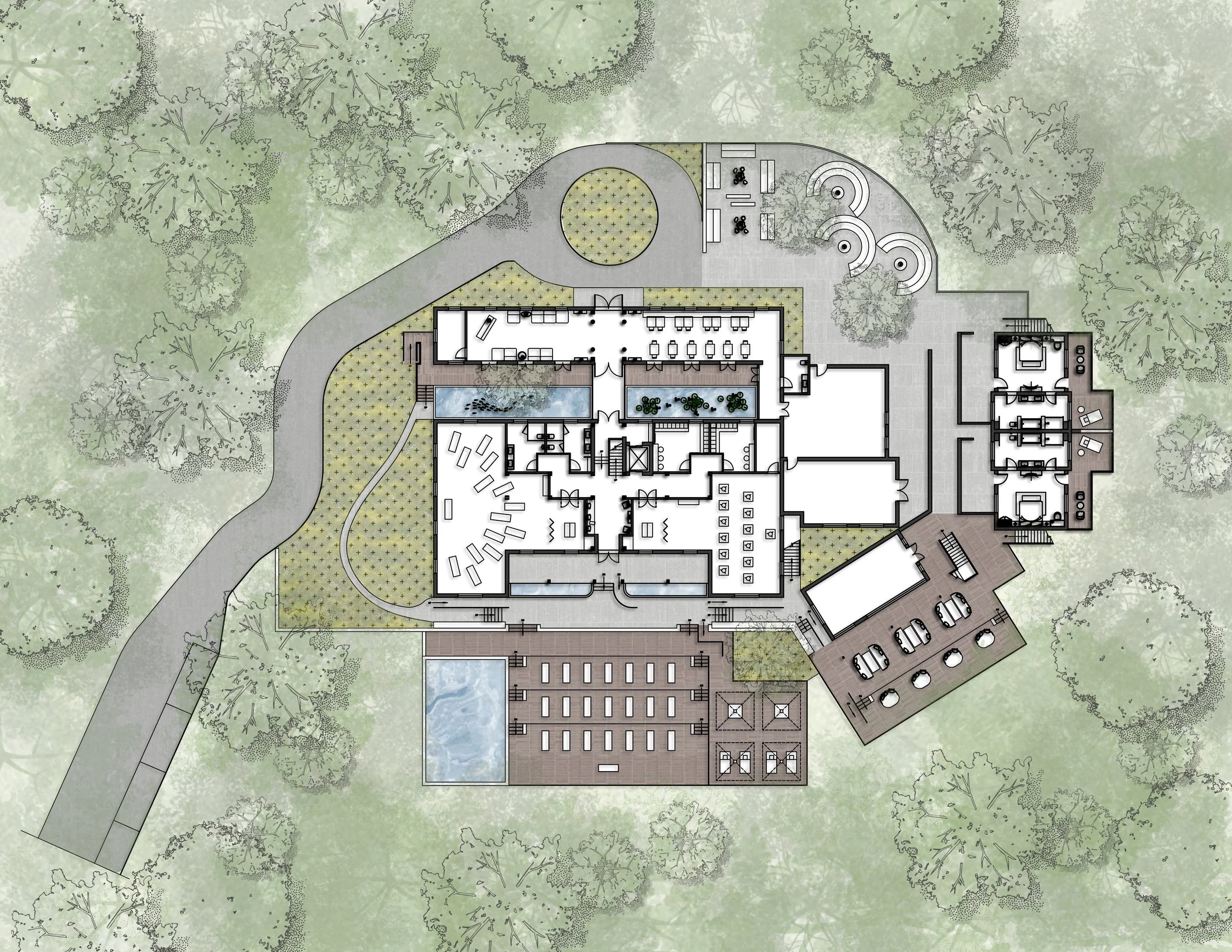 Is a life without anxiety possible? Many of us have grown accustomed to waking, working, and sleeping amidst anxiety. How can we shift from a constant state of anxiety to one where we occasionally experience anxiety but are mostly happy? Achieving a life without anxiety is possible when we liberate ourselves from the compulsive pursuit of specific goals and the sense of belonging they offer. It is important to understand who we are, cultivate a consistent sense of peace, and build genuine self-confidence. Nature plays a therapeutic role in promoting mental health by reducing activation in the amygdala, the stress-related brain area, and preventing mental disorders like anxiety and depression. My thesis will explore the possibility of a less anxious life by leveraging the therapeutic effects of natural environments and practices such as yoga and meditation. It will delve into how architecture, when embedded in the natural environment, can foster a closer bond between individuals and nature. This bond, supplemented by mindfulness practices, can alleviate anxiety, improve psychological well-being, enhance self-esteem and self-efficacy, and ultimately increase our happiness index, leading to a peaceful return to daily life.