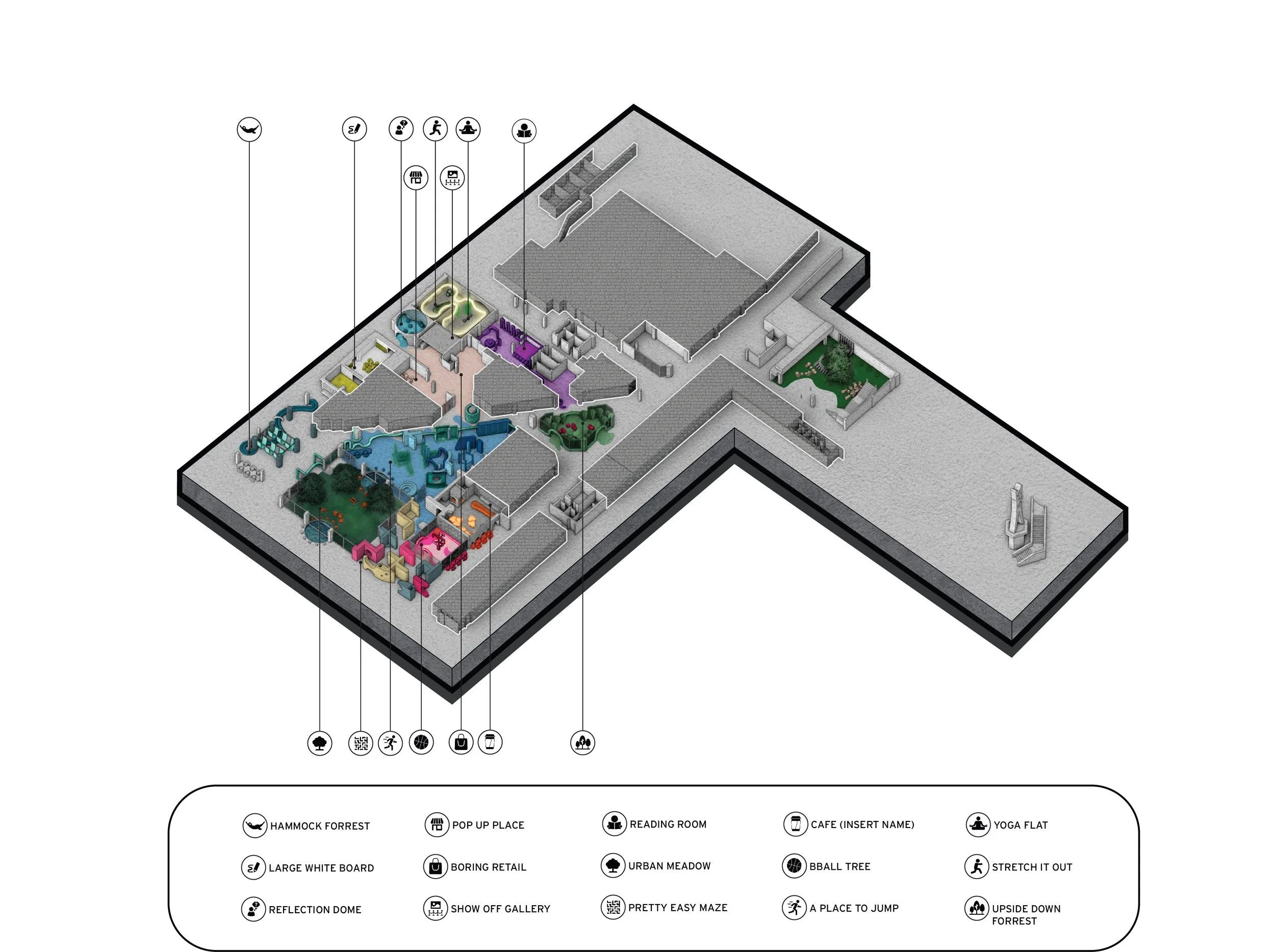 George Bernard Shaw once said, “We don’t stop playing because we grow old; we grow old because we stop playing.” Generally, adults grow out of playing. Why? Play is inherently human, fulfilling a need for expression resulting in mental and physical health benefits. Play releases endorphins – the body’s natural feel-good chemical. Play is contained, curated, and only acceptable in specific spaces. However, it is a necessary component for our everyday happiness. Should we have to seek playgrounds or parks to fulfill our playful desires? Imagine if we encountered playful design in our daily, everyday spaces? What would these architectural details and elements look like? The focus of my thesis is to figure out how to design playful elements into our everyday spaces to promote and provide more opportunities for adults to play.